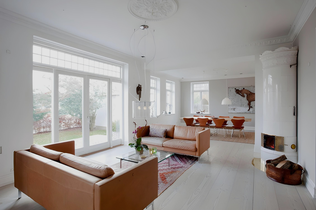 Den nye tilbygning har styrket forbindelsen imellem villaens rum. Her er det et kig ind i tilbygningens spisestue set fra opholdsstuen i den oprindelige del af villaen. Også set indefra er overgangen mellem nyt og gammelt nærmest usynlig.