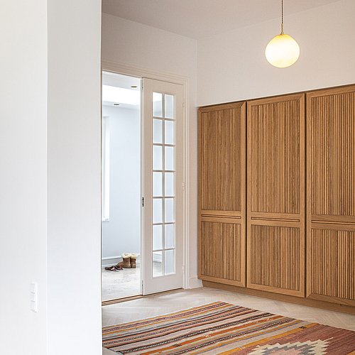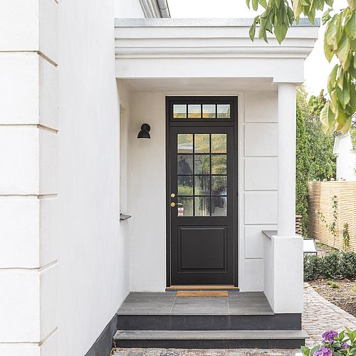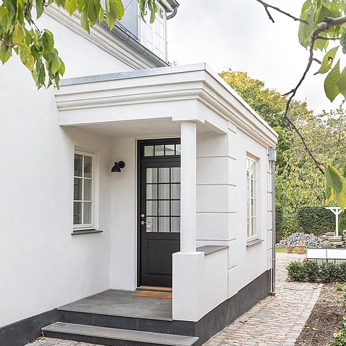 Bygherre ønskede et bedre køkken-alrum til den fine, klassiske patriciervilla, hvor der var god kontakt til den smukke have. Derudover skulle den snævre entré forbedres med mere lys og plads. Projektet blev derfor at lave lave en helt ny entré med ovenlys og indbyggede skabe samt en mere direkte adgang til husets flotte stuer. Den skulle samtidig være præsentabel og byde beboere og gæster velkommen på en smuk måde.