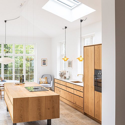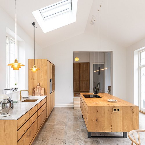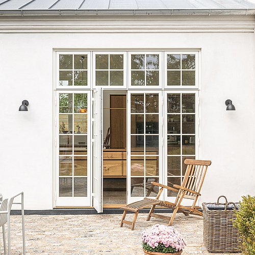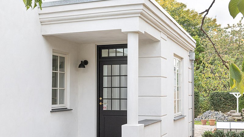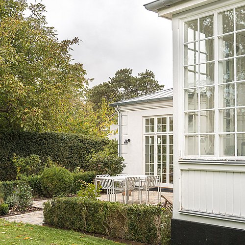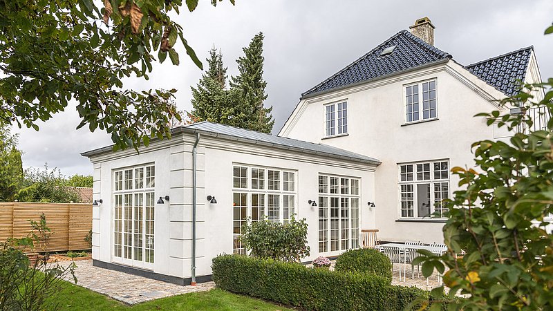 Den nye tilbygning med køkken-alrum skulle give en oplevelse af at sidde i en havestue, så det var vigtigt med direkte udgang og udsyn samt et godt dagslys hele dagen. Samtidig skulle bygningen visuelt hænge naturligt sammen med husets klassiske arkitektur med kvaderpuds og sprossede vinduer.