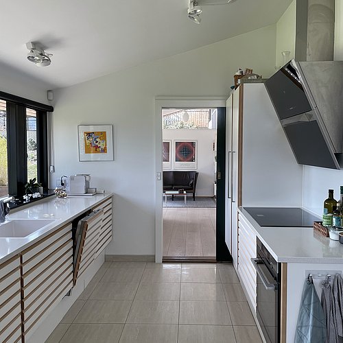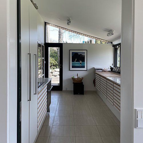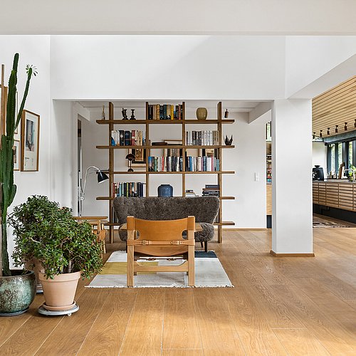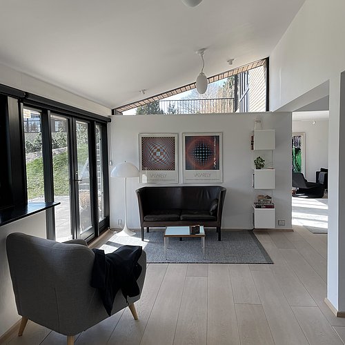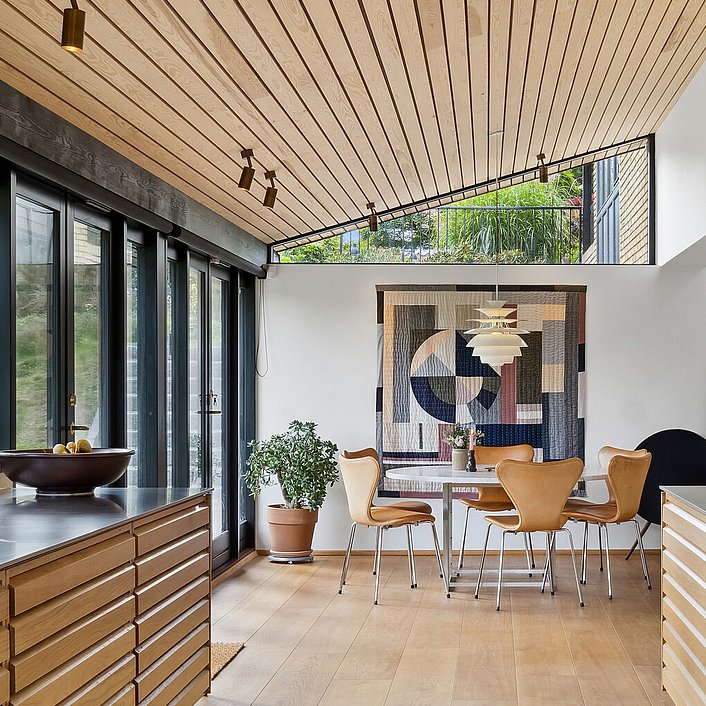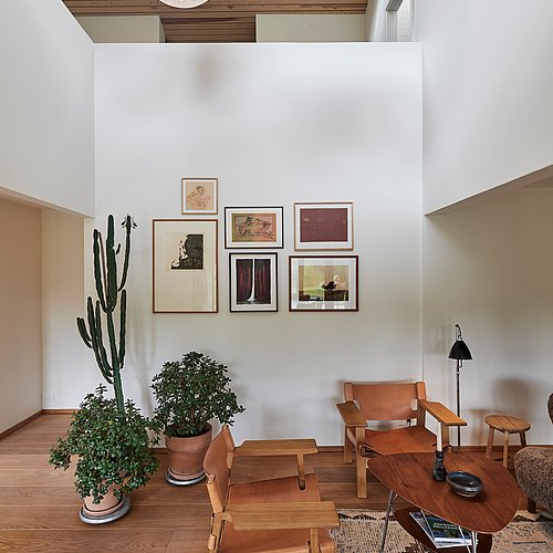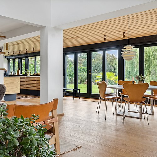 Væsentlige karaktertræk som gennemgående rem og træloft er genskabt. Åbninger mod have samt forbindelse mellem etager er styrket og indretningsmuligheder samt dagslysforhold er forbedret, mens sansevækkende naturmaterialer samler sig i en ny atmosfærefyldt helhed.