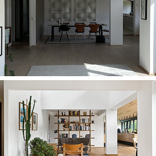 Med enkle greb i planløsning og gennemgribende ændring af materialeholdning fremstår huset fra 1970’erne med styrket/genskabte arkitektoniske værdier efter renoveringen.