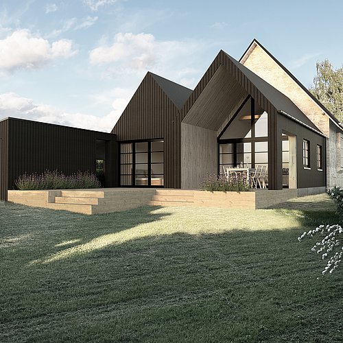 Fra den åbne terrasse er der passage til den nye carport. Carport, skur og tilbygning udføres ensartet i facader af sortmalet grantræ, tagpaptag og underbeklædning i fyrretræslister.