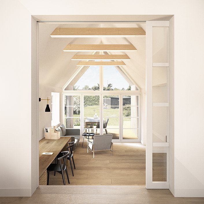 Tilbygningen er sammenbygget med den oprindelige del omkring et tidligere terrassedørhul og ligger i forskudt plan for at give boligen en mere direkte og naturlig kobling til haven med niveaufri adgang til det nye overdækkede og åbne terrasse.