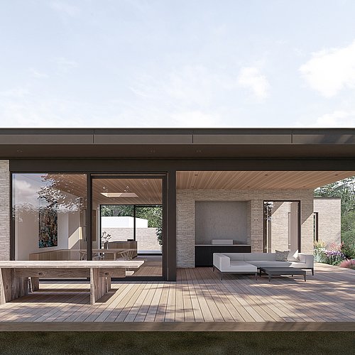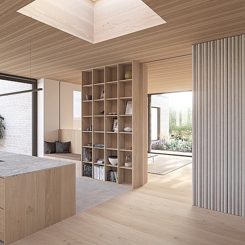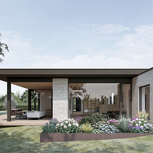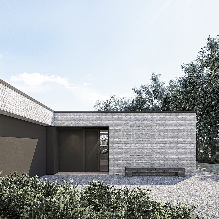 Villaen består af teglvolumener, der indeholder villaens lukkede private rum - værelser, badeværelser, bryggers og garage. Imellem teglvolumenerne opstår villaens åbne fælles rum - køkken, spisestue og stue. I de åbne rum er tagfladen hævet op over teglvolumenerne - her er højt til loftet og udsigten til haven inviteres helt indenfor med de store glaspartier. Tagfladen skærmer de åbne rum for overophedning, og danner en overdækket terrasse.
