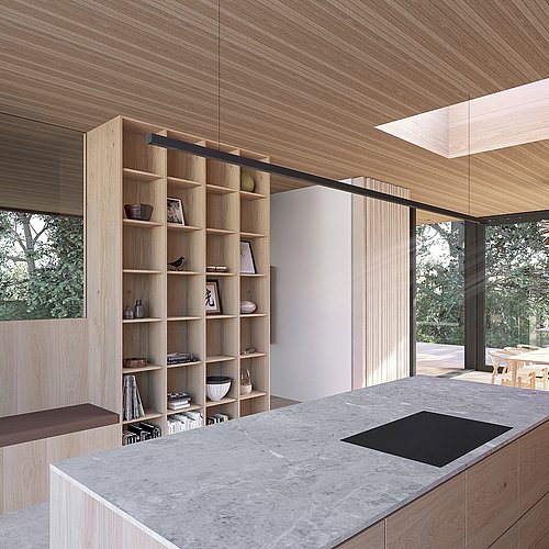 Villaens arkitektur er inspireret af naturen omkring den. På denne grund er der smukke og ret forskellige udsigter til alle verdenshjørner, og husets rum er placeret så både udsigt og funktion giver mening. Villaen består af åbne leverum og private rum, der inviterer til ro og fordybelse.