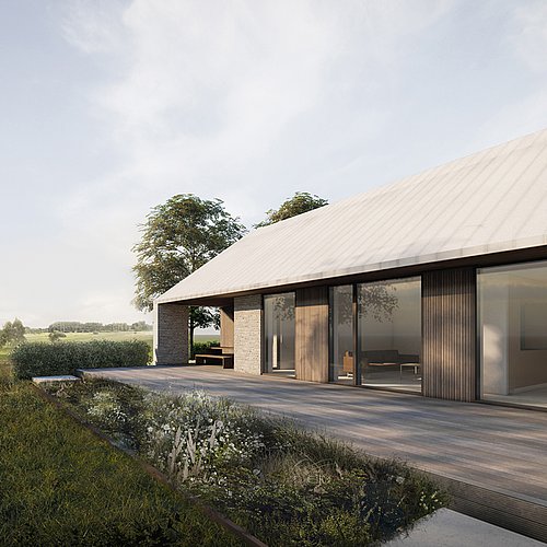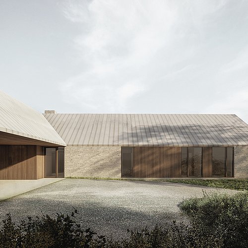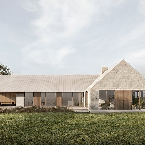 Field House er smukt placeret mellem markerne. Et moderne landhus med 3 længer sammenbundet af et elegant saddeltag. Den velkendte arkitektur ved den traditionelle gårdtype defineres på ny med nærhed til naturen og samtiden. Allerede fra entreen får man et glimt af udsigten ud over de åbne marker, som folder sig ud fra boligens rum. Fra husets hjerte i køkken alrummet er der kig til forældrenes afdeling mod øst, børnenes afdeling mod vest og de fælles rum mod syd. I orangeriet inviteres naturen indenfor med de store vinduespartier mod det åbne landskab. Huset forholder sig til det omkringliggende landskab med sine afdæmpede jordfarver i tegl, træ og ståltag. En moderne bolig der danner rammen om det gode familieliv og sociale stunder.