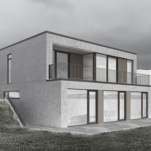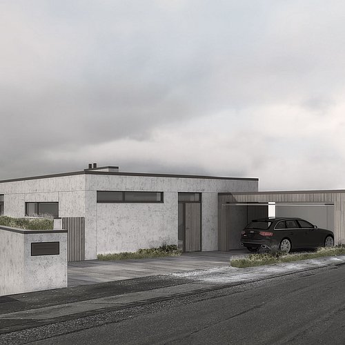 Med fabelagtig udsigt over Kolding Fjord har vi tegnet denne villa i 2 plan på en flot skrående grund. Huset tilpasser sig grunden med materialer der bliver en del af naturen men stadig står skarpt og moderne i sit udtryk