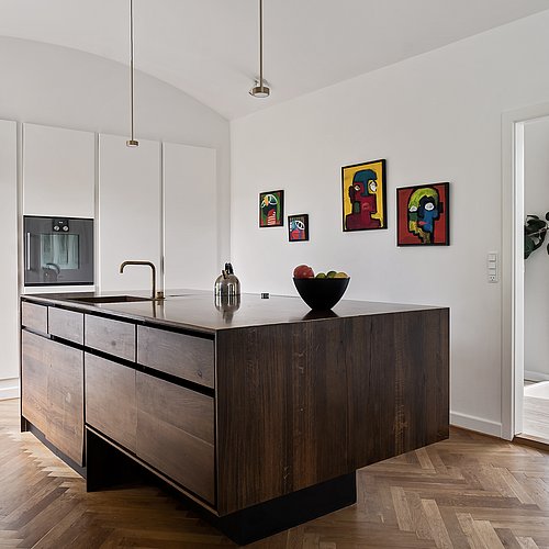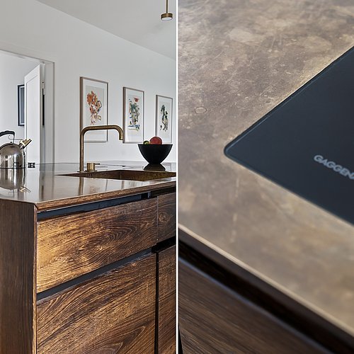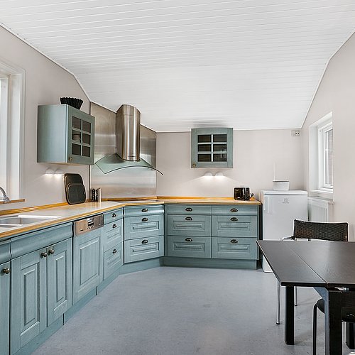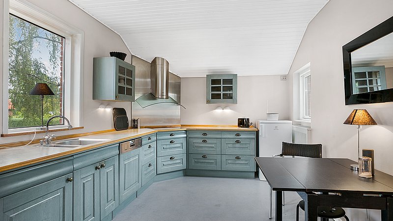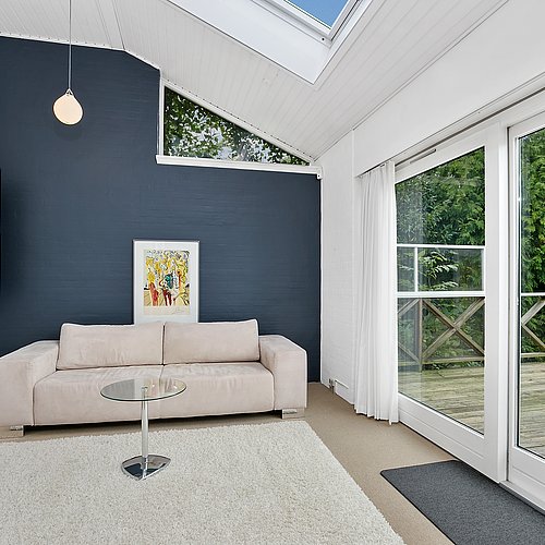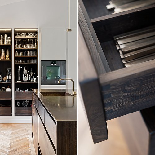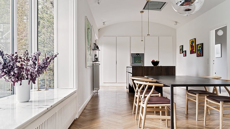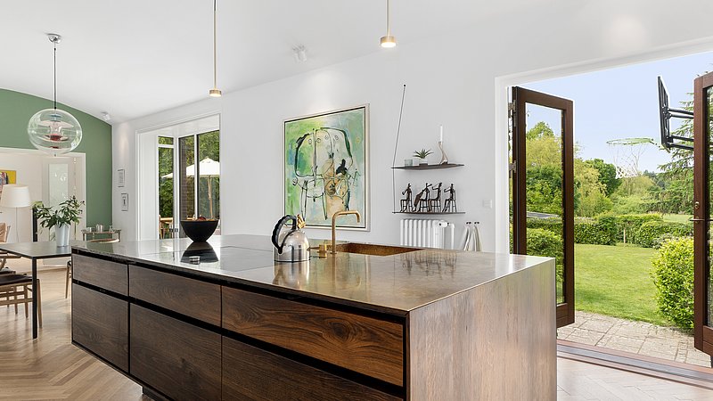 Indvendigt var den største værdi for boligejeren en planløsning, der fungerer. Køkkenet blev flyttet til husets bedste rum og åbnet til et lyst køkken-alrum med buet loft, hvor dagslys, udsigt og bevægelse hænger sammen. Køkkenet er tegnet specifikt til huset og udført af snedker: en køkkenø i røget eg med massiv messing bordplade, en rolig højskabsvæg samt indbyggede skabe og skabrum, der samler kaffestation og småapparater, så bordpladerne kan holdes fri. Den tidligere udestue (fra 2001) blev ombygget til egentlig dagligstue med nyt vindue og terrassedøre, sildebensparket i stedet for fliser og justering af bærende væg, så rummet fungerer året rundt. For at understøtte husets tidsånd blev de oprindelige Swedoor-dobbeltdøre udskiftet til genbrugte døre fra 1940’erne – med et håndskåret fiskemotiv i glasset som fin detalje.