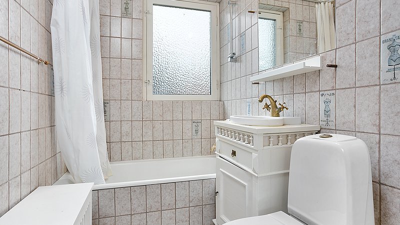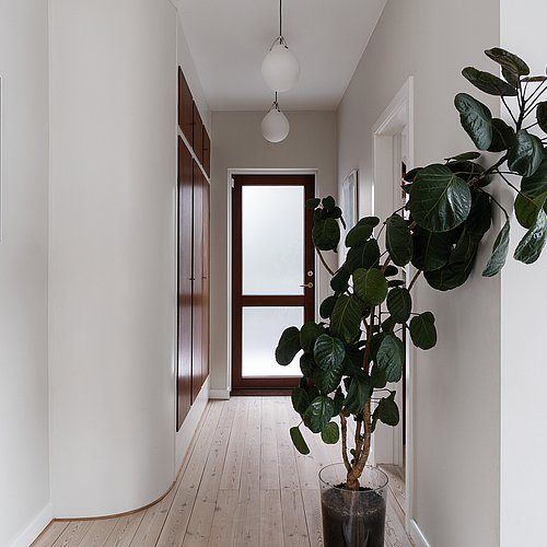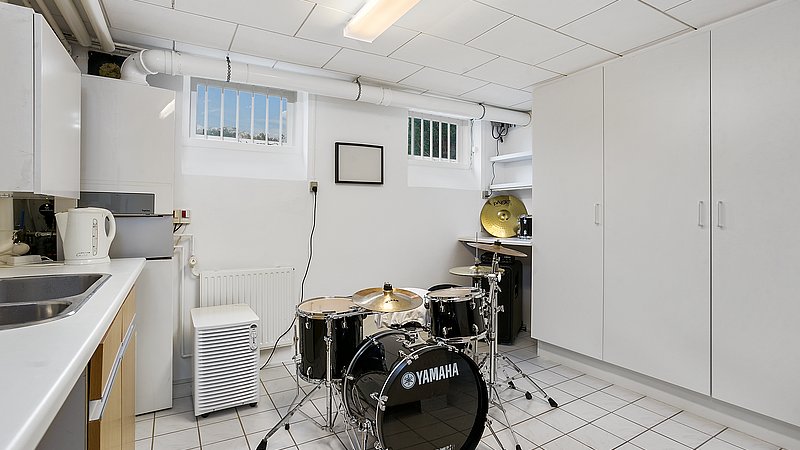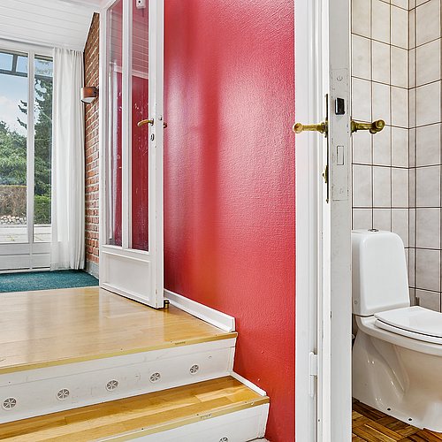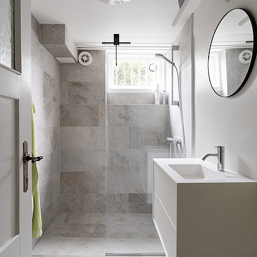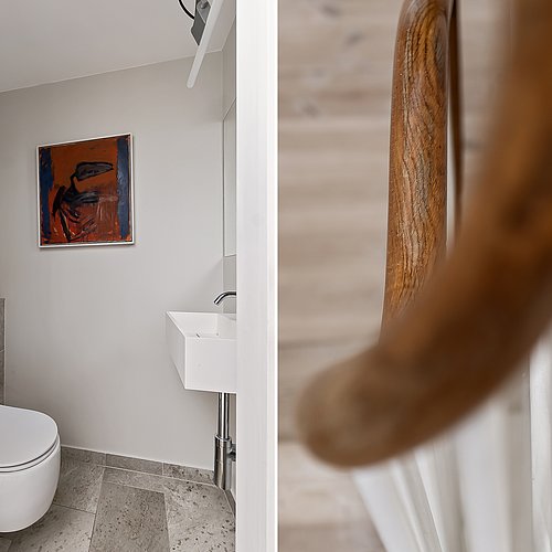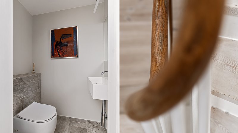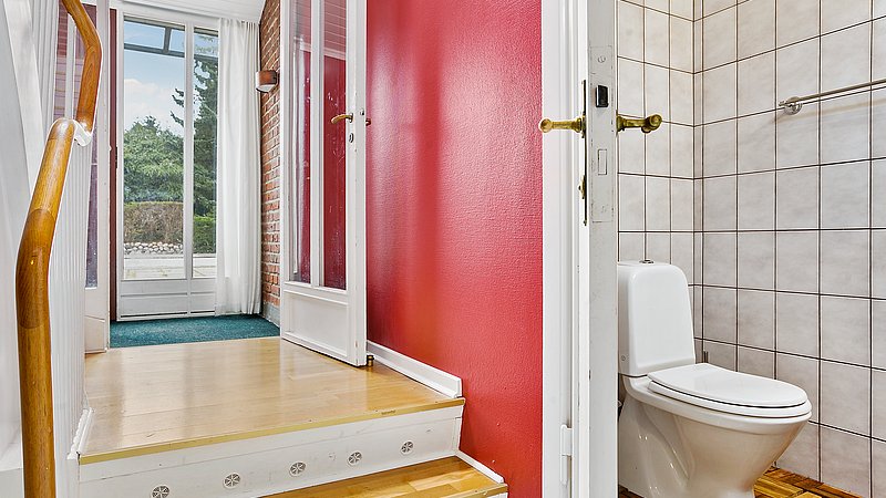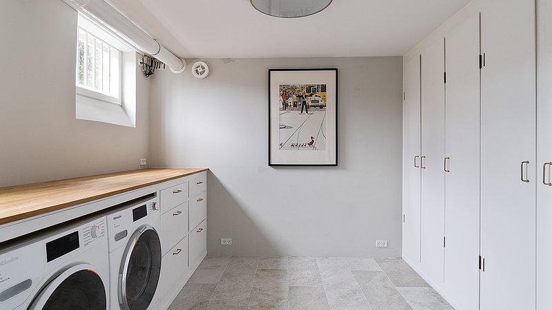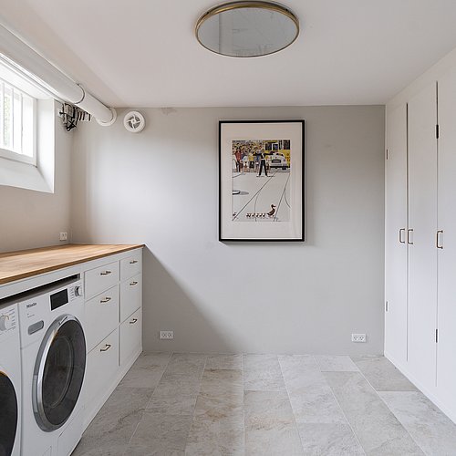 Flytningen af køkkenet frigav plads til et ekstra værelse og en ny fordelingsgang med indbyggede skabe. Et genbrugsskab blev indbygget i en hvid ramme med klassisk bue, så opbevaring blev en naturlig del af arkitekturen. Badeværelset i stueplan blev udvidet med bedre bruseniche, og der blev etableret et nyt badeværelse i kælderen som del af en større kælderrenovering. Det løftede husets funktion markant og gav samtidig plads til endnu et kontor, så boligen i dag kan rumme både familieliv og arbejdsdag. Resultatet er en villa renovering, hvor boligejeren fik et mere sammenhængende udtryk, bedre indeklima og en hverdag, der glider lettere – med materialer, der holder og detaljer, der passer til huset. Netop derfor giver en villa renovering her både arkitektonisk sammenhæng og mærkbar værdi i daglig brug.