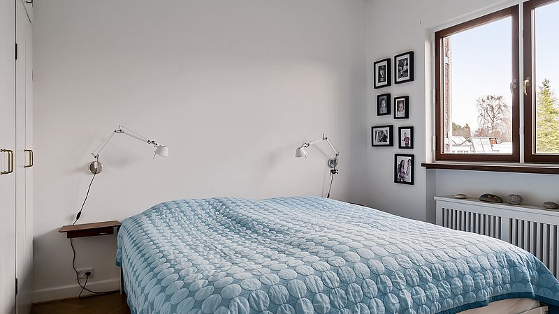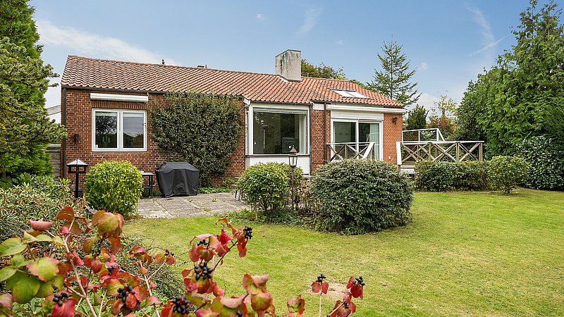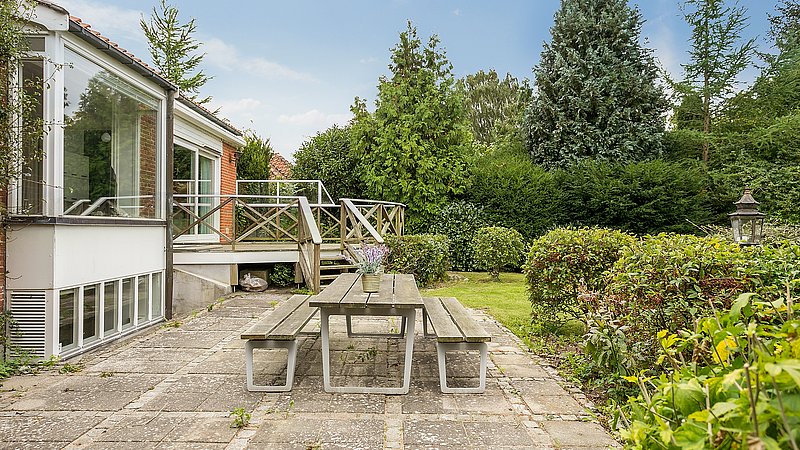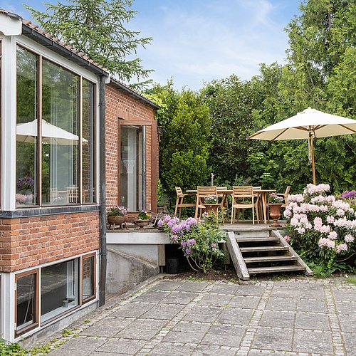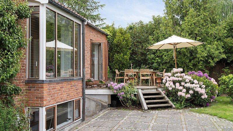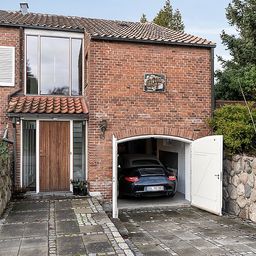 Udvendigt blev facaden samlet med genbrugte mursten i samme format som de originale. Karnappen blev nænsomt restaureret og opbygget med murstenskaller mellem nye bjælker, så detaljerne står skarpt, men diskret. Huset fik nye vinduer og døre med hvidmalede karme og olieret mahogni, der giver varme og en tydelig reference til periodens materialer. En tidligere skydedør blev erstattet af en terrassedør i husets stil, og der blev etableret en ekstra terrassedør fra køkkenet, så adgangen til haven blev enkel i hverdagen og samtidig skabte en rolig symmetri i facaden. Garagen blev fastholdt som en integreret del af huset; den oprindelige port blev udbedret for råd, og et linjedræn foran porten sikrer afvanding uden at ændre udtrykket.