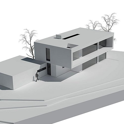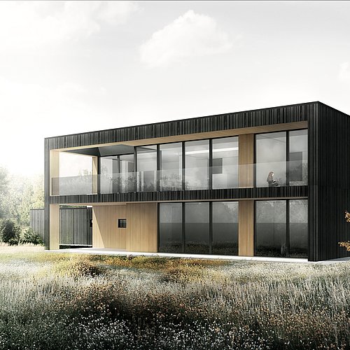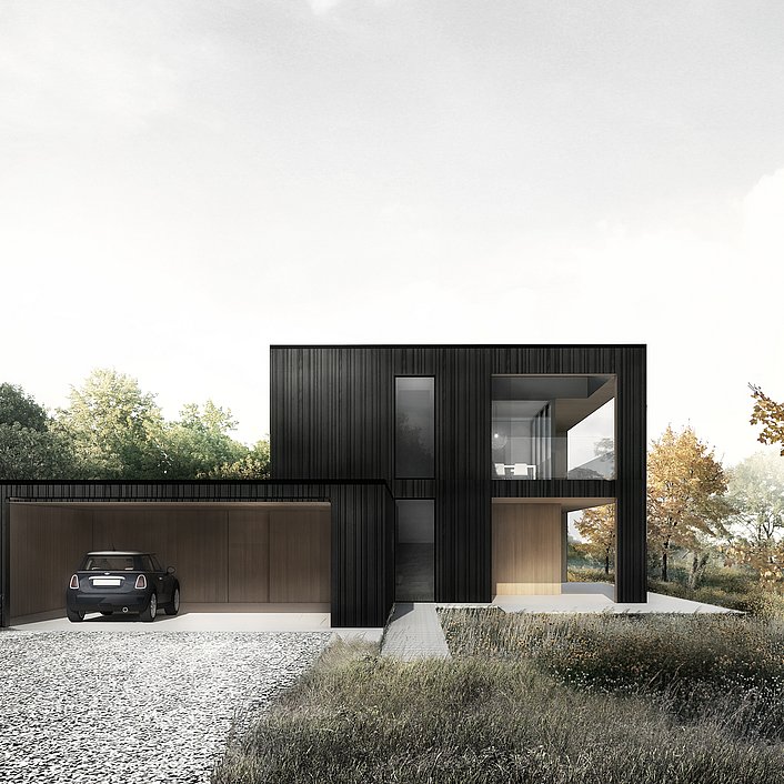 Boligen er opført som en kubisk cedertræsæske, der lukker op for naturen, der trækkes ind sammen med den tilbagetrukne facade. Ude og inde smelter sammen i den overdækkede terrasse, der ved materialeoverflader understreges som et arkitektonisk greb.