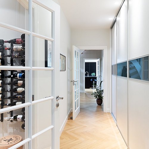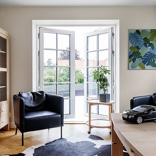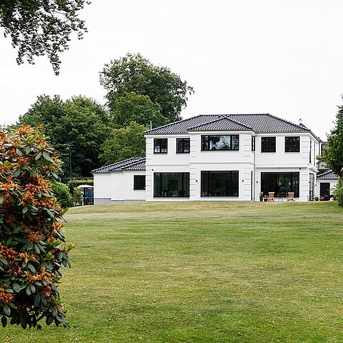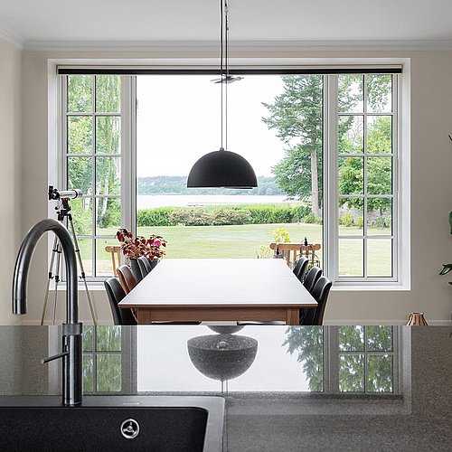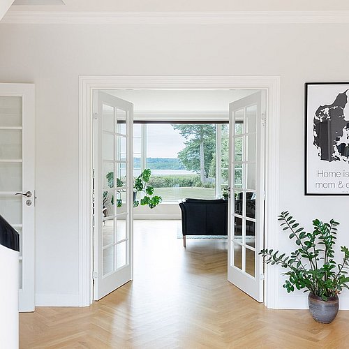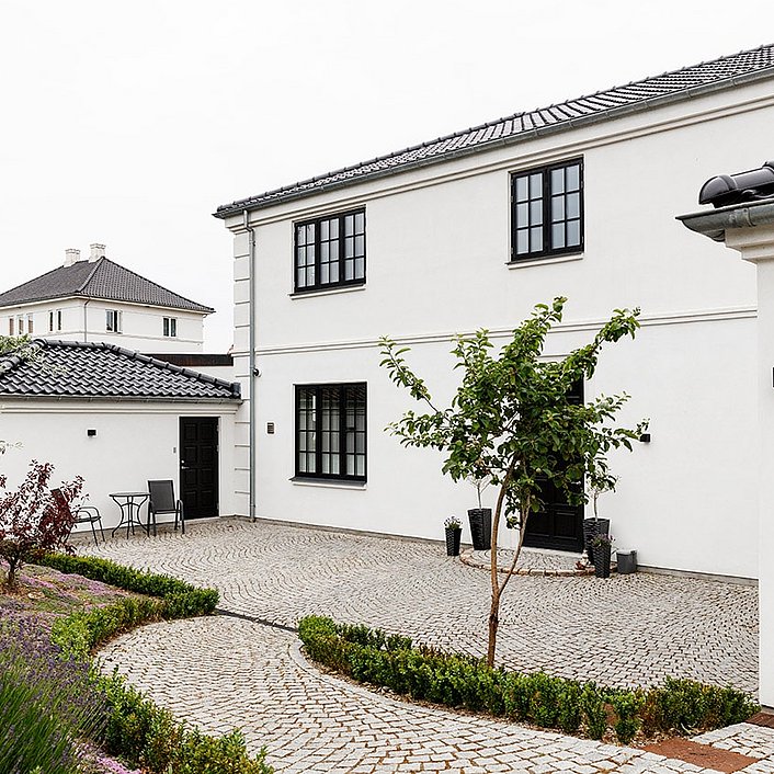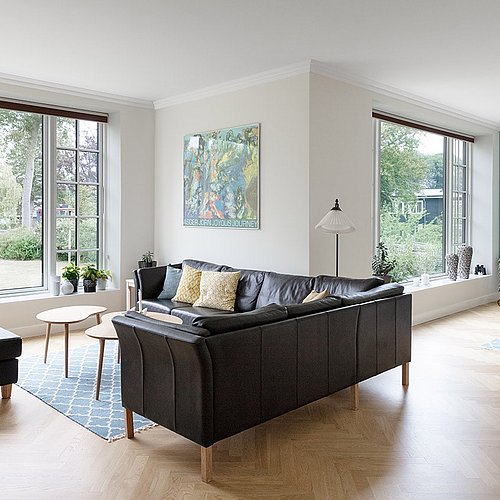 Samtidig blev de arkitektoniske detaljer afstemt, så villaen både fik et klassisk udtryk og en nutidig funktionalitet. Arkitekten frarådede for eksempel småsprossede vinduer overalt, fordi de ville begrænse udsigten, og foreslog i stedet en løsning, hvor palævillaens stil blev bevaret uden at lukke landskabet ude. På den måde blev huset formet med respekt for både arkitekturen og stedet.