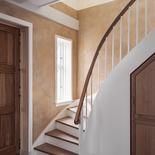 Alle rum er apteret med snedkerinventar, trapper og døre, der er tilpasset husets proportioner. Store vinduer og døre indrammer den naturskønne udsigt og trækker lyset ind i rummene. I tagetagen giver en markant kvist ekstra rummelighed og styrker sammenhængen mellem etagerne.