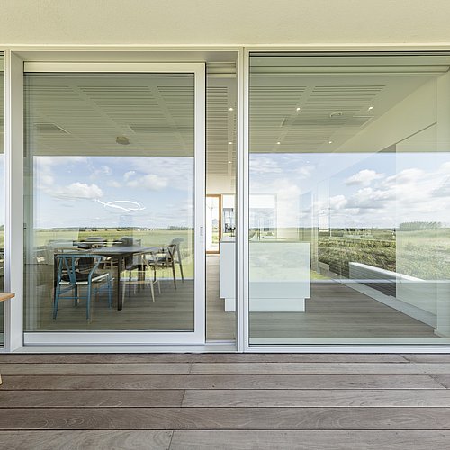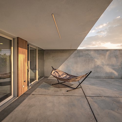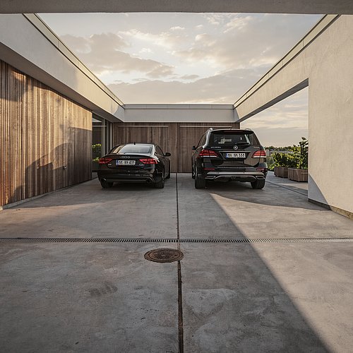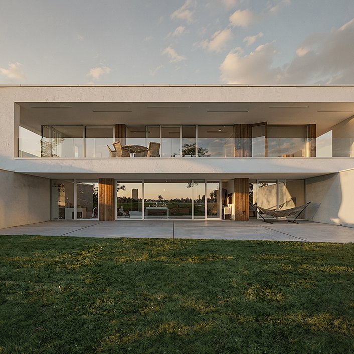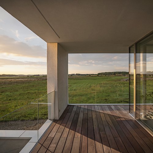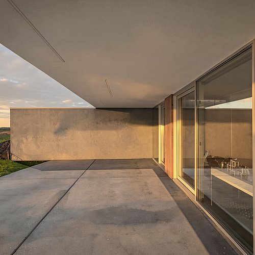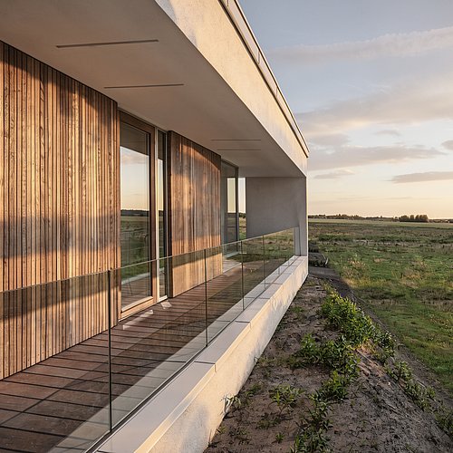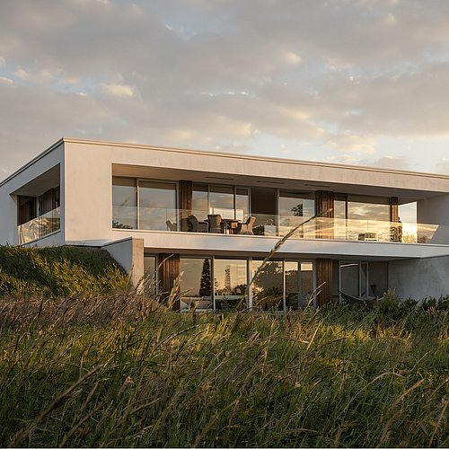 Villaen ligger i et kuperet åbent landskab, hvor to betonskiver kiler sig ind i terrænet og bærer den hvide pudsede kasse. Den stringente form står i stor kontrast til områdets grønne natur, men blødes op af egetræslister, der dækker facaden.