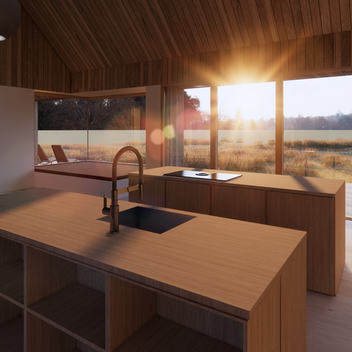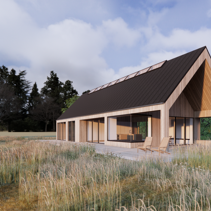 Landhuset her er beliggende på en grund med fri udsigt over marker. Huset er orienteret så aftensolen kan nydes fra dels opholdsrummet men også fra soverum, badeværelse og den overdækkede terrasse. Huset er ligeledes udformet så der kommer det helt rigtige lysindfald. Dette gøres dels med store glasarealer men også med et langt rytterlys i loftet. Materialevalget, hvor hovedvægten er lagt på Douglasgran er valgt ud fra at det skal kunne gå igen både ude og inde.