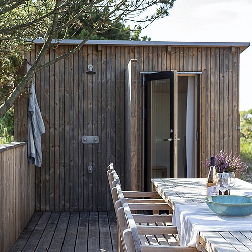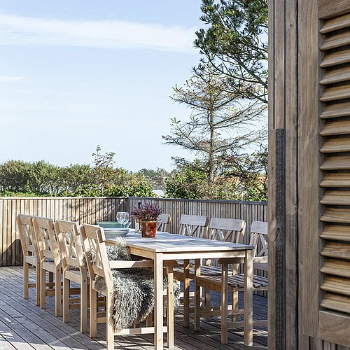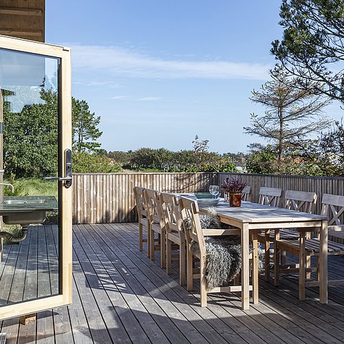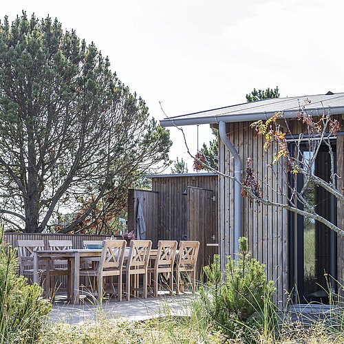 Terrasserne ligger i to niveauer mod vest og mod øst er terrassen med udekøkken og udebrus delvist afskærmet mod vejen.