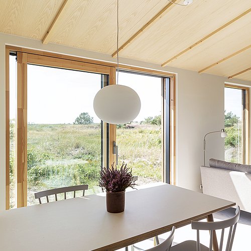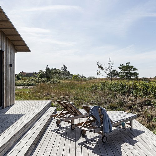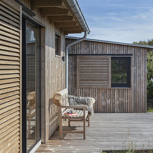 Grunden ligger delvist i Natura 2000 zone og trods det fik vi mulighed for at etablere terrasser omkring huset, som primært henvender sig mod syd og vest ved hjælp af store glaspartier. Enkelte glaspartier har fået tilføjet skodder i træ.