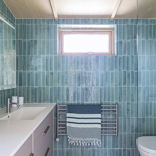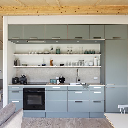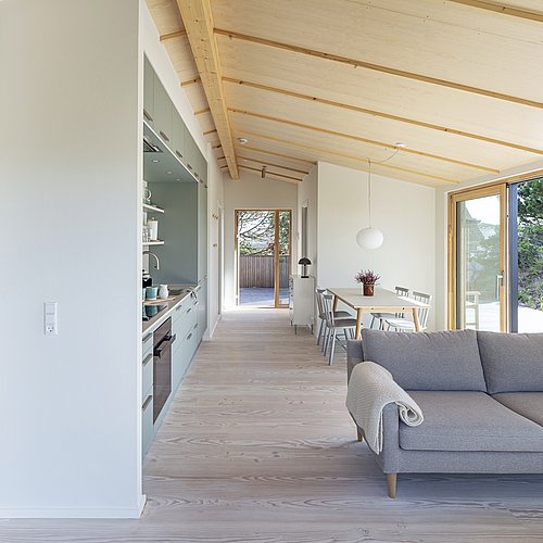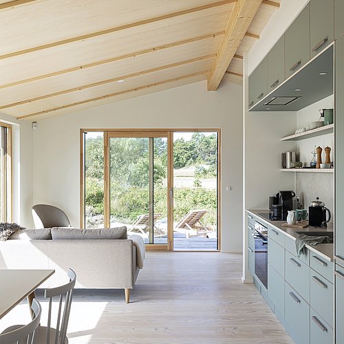 Indvendig er lofter beklædt med askefineret krydsfiner, væggene er hvidmalede og gulvet er massive planker af douglas træ. Køkkenet og fliserne i badeværelset er holdt i grønne toner.
