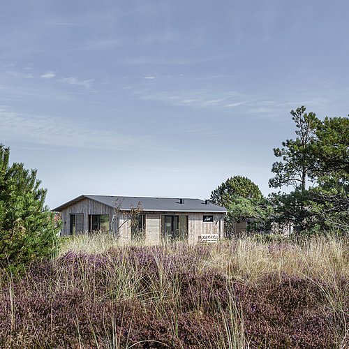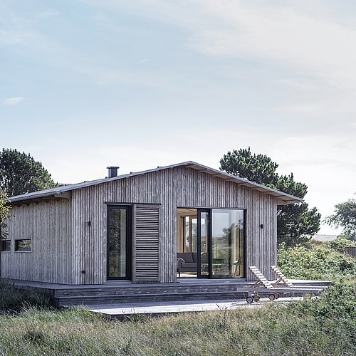Sommerhuset ligger på kanten af by og hede landskab – en unik beliggenhed og det stod færdig i sommeren 2025 – klar til indflytning. Med et bruttoareal på 54 m2 kan det nærmest kaldes et Tiny House, men det rummer, til trods for den ydmyge størrelse, alle funktioner til en familie med store børn.