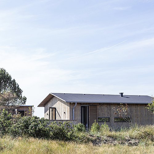 Facaderne er beklædt med Kebony træ og taget er beklædt med tagpap. Døre/vinduespartier er udvendigt sorte og indvendigt fyrretræ. Terrasser er belagt med Kebony terrasseplanker.