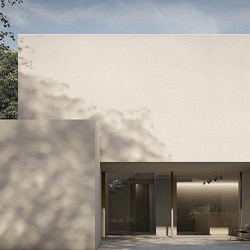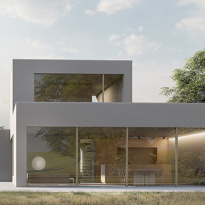På en rektangulær grund i midten af byen ligger Minimal House. Med sit stramme udtryk, danner den moderne beton villa rammerne for hverdagen i byen. De skarptskårne volumener skærmer af ud mod vejen, mens der åbnes op ud til intime gårdrum og terrassen med morgensol. Sigtelinjer på langs af boligen forstærker det arkitektoniske greb. Den rå beton brydes af egetræslister og store vinduespartier, der inviterer naturen med ind i villaen.