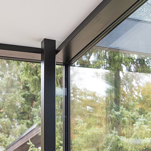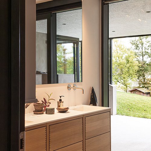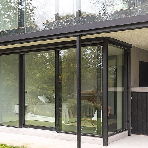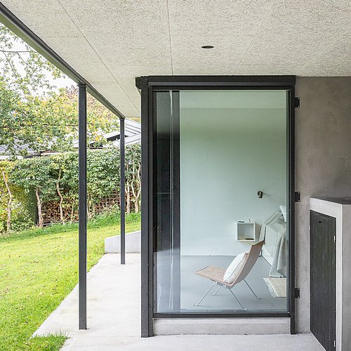 Huset skulle være så let og luftigt som muligt i sit udtryk over jorden, og underetagen ligger delvist gravet ind i skrænten som en tung ”base” i beton.