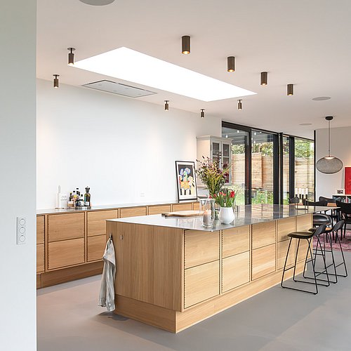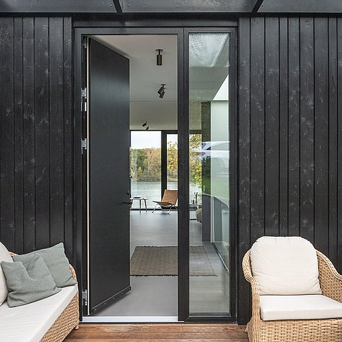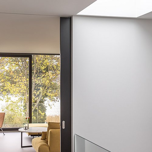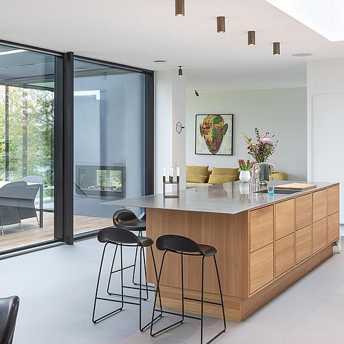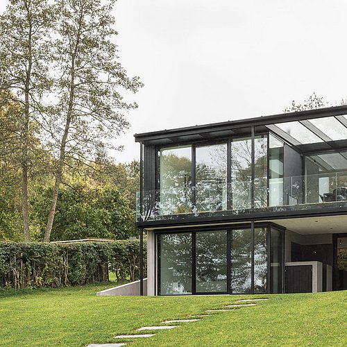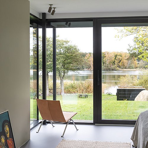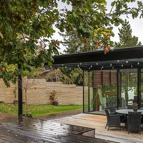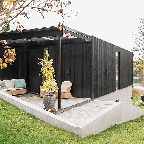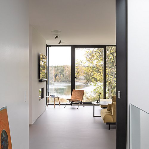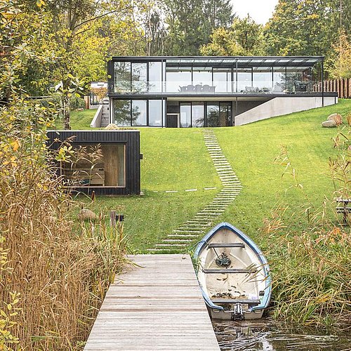 Da den helt unikke grund kom til salg, var bygherre slet ikke i tvivl om, at det var her, de skulle bygge deres drømmehus. Grunden skråner ned mod en stor sø i det skønne Nordsjælland og ligger med skoven i baghaven. Huset ligger altså som en transparent æske mellem sø og skov, og det var derfor af stor betydning for projektet at skabe ophold på begge sider af huset og mest mulig udsyn til naturen rundt om huset.