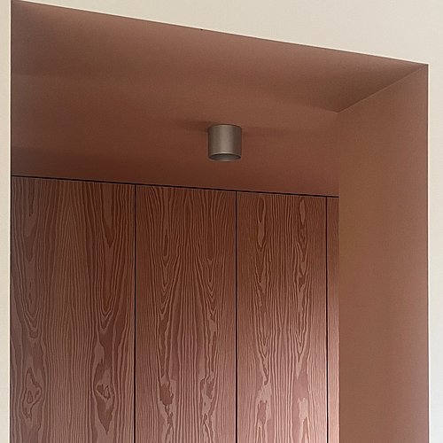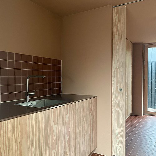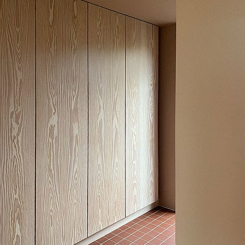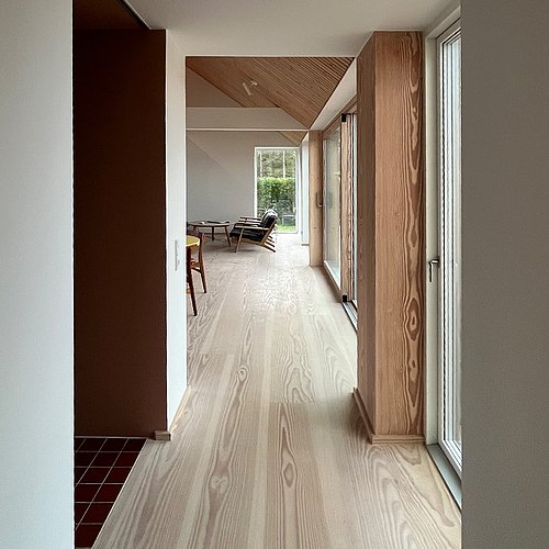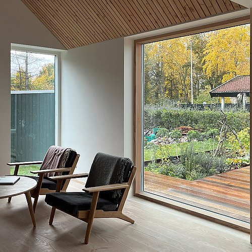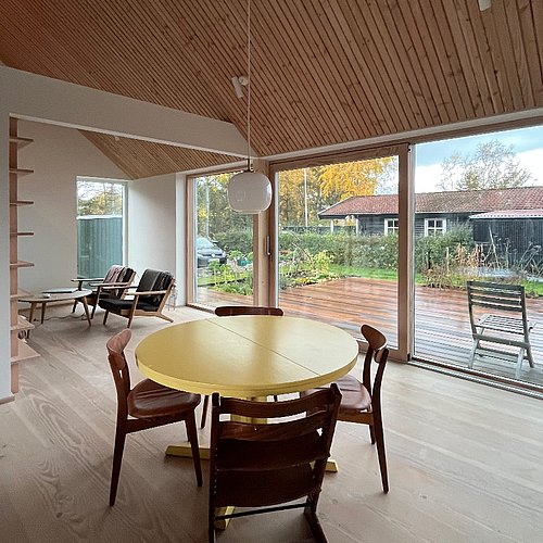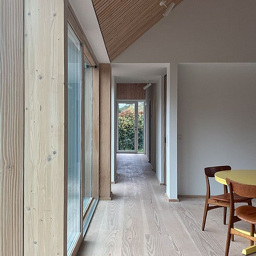 Indvendigt fortsætter den rolige æstetik med lyse plankegulve, hvide vægge og lofter med synlige trælameller. Store glaspartier sikrer et generøst lysindfald og visuel forbindelse mellem inde og ude. Planløsningen er åben og funktionel med klare sigtelinjer, indbyggede reoler og en enkel køkkenløsning, der understøtter husets minimalistiske og hjemlige karakter.