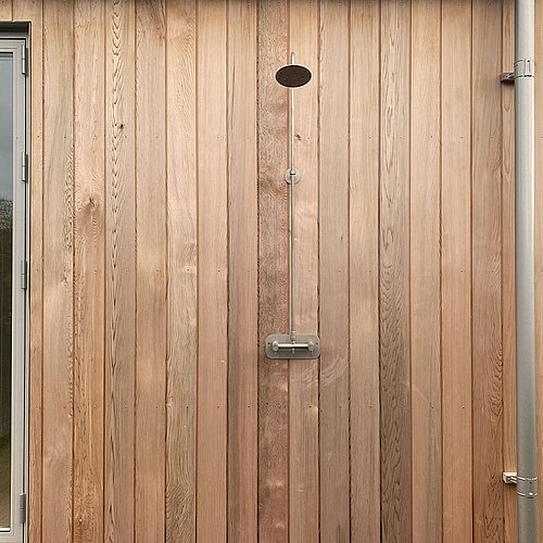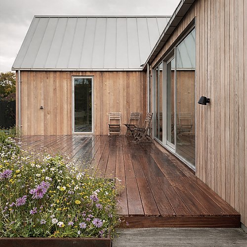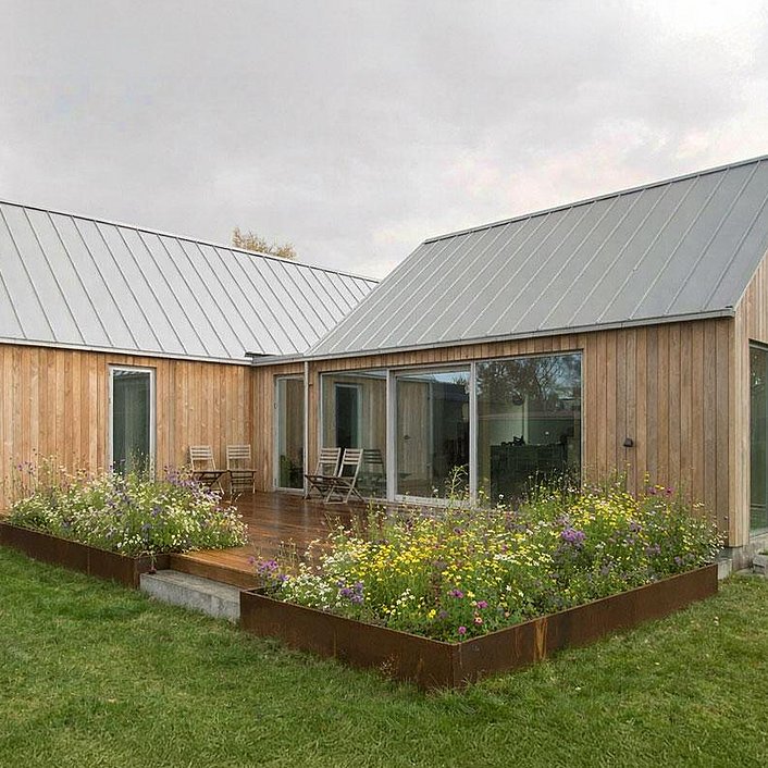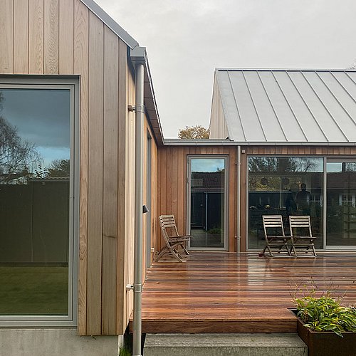 Dette moderne enfamiliehus fremstår som en enkel og harmonisk helhed, hvor arkitektur og materialer er nøje afstemt. De lyse træfacader patinerer smukt og giver et varmt, nordisk udtryk, mens de markante saddeltage i metal tilfører et stramt og tidløst præg. Bygningen består af to længer, som samles omkring en beskyttet træterrasse og skaber et naturligt uderum med tæt kontakt til haven.