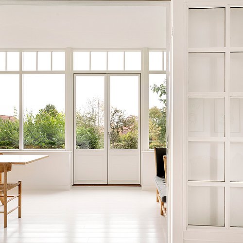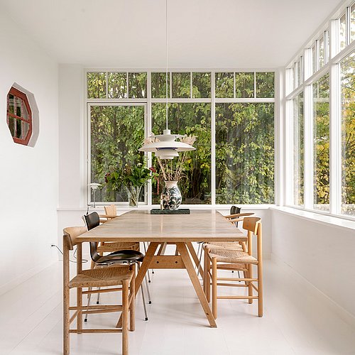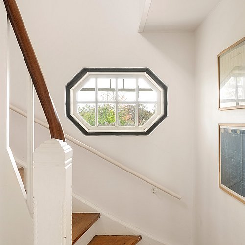 Indvendigt er der arbejdet bevidst med at skabe en glidende overgang mellem den gamle og den nye del af huset. Et oprindeligt vindue ved trappen er bevaret, så man nu kan kigge ind i tilbygningen og videre mod haven. Denne detalje understreger både villaens historie og den nye sammenhæng mellem rum og have. Den originale trappe står fortsat som et smukt, tidstypisk element og er med til at fastholde husets romantiske sjæl.