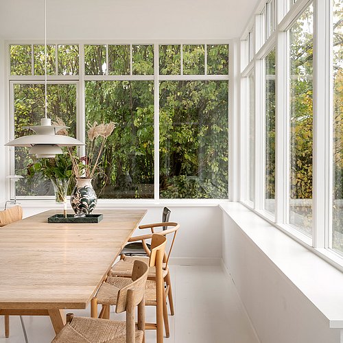Et af projektets vigtigste greb er den markante åbning mod haven. De store vinduespartier i tilbygningen giver ikke kun et generøst lysindfald – de skaber en tæt, visuel og rumlig forbindelse mellem hjem og natur. Fra det nye opholdsrum kan familien følge haven gennem årets skiften, fra det farverige forår til efterårets bløde, varme blade. Lyset og naturens stemning bliver en aktiv del af hjemmets atmosfære og ændrer sig fra dag til dag.