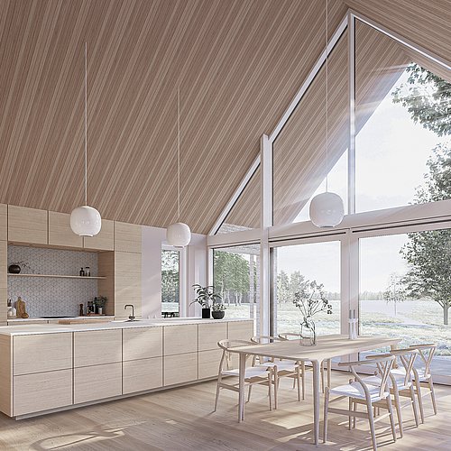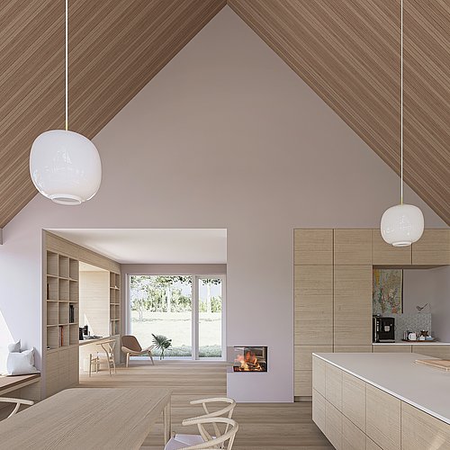 De gennemlyste rum bringer boligens rum tættere på naturen omkring den, og giver et venligt, naturligt lys indenfor. Det åbne køkken-alrum -ligger mod syd og vest, hvor udsigten over søen og landskabet rækker længst ud. Stuen ligger lige som husets master bedroom ud mod gårdens have med store, gamle træer.