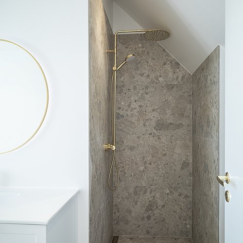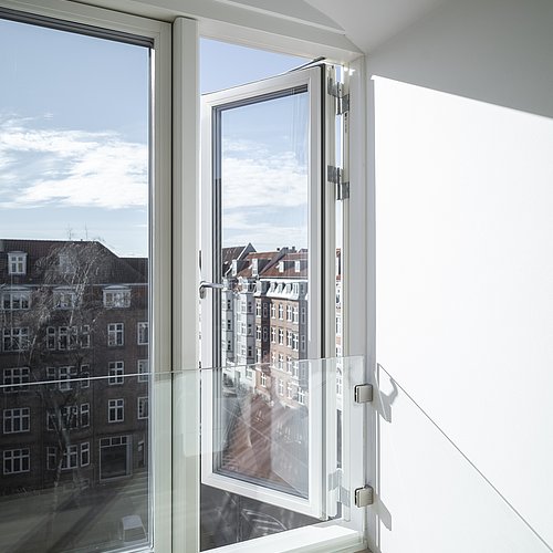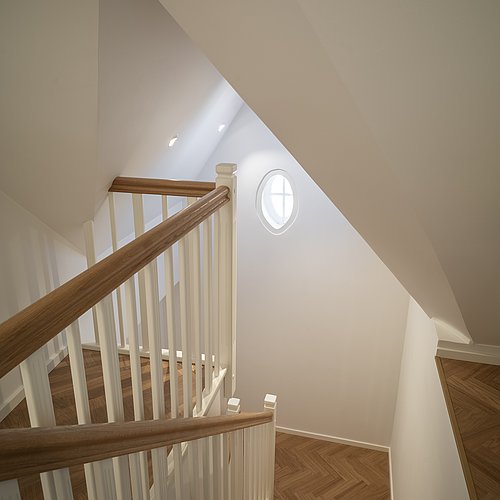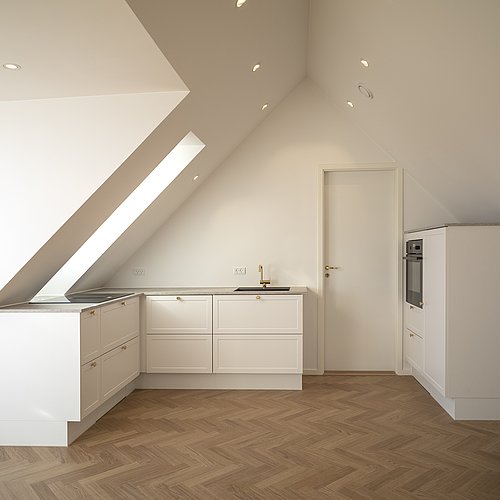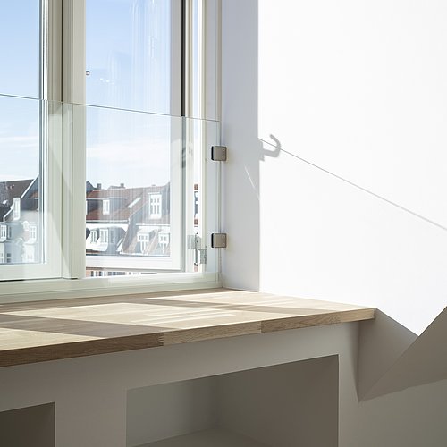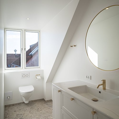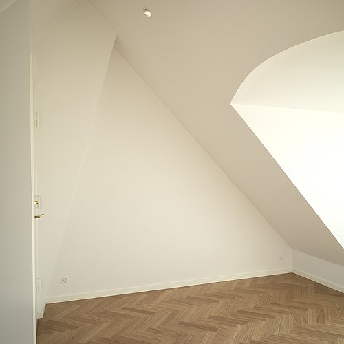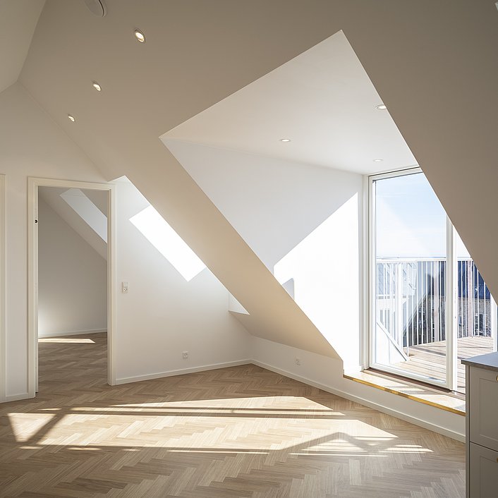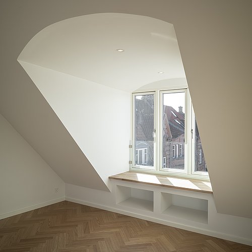 Et uudnyttet tagrum på toppen af en yderst bevaringsværdig etageejendom hvor pigerne sov i gamle dage viste stort potentiale for indretning til tagbolig. Det triste og slidte tagrum er nu erstattet af en smukke, lys og venlig tagbolig badet i dagslys. Udsigt over byens tage er en ekstra luksus ved at bo øverst, og derfor har tagboligen også tagterrasse med direkte adgang fra boligen. Udnyttelsen af ejendommens eksisterende arealer og volumen er fornuftig tilføjelse af ekstra kvadratmeter og bidrager for ejendommens øvrige boliger med et godt isoleret tag og renovering af installationer mm.