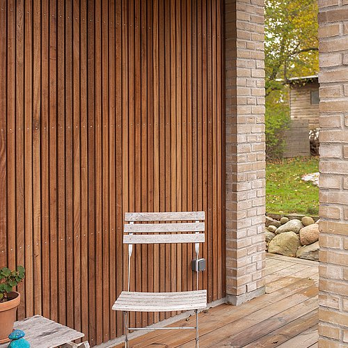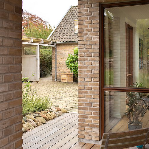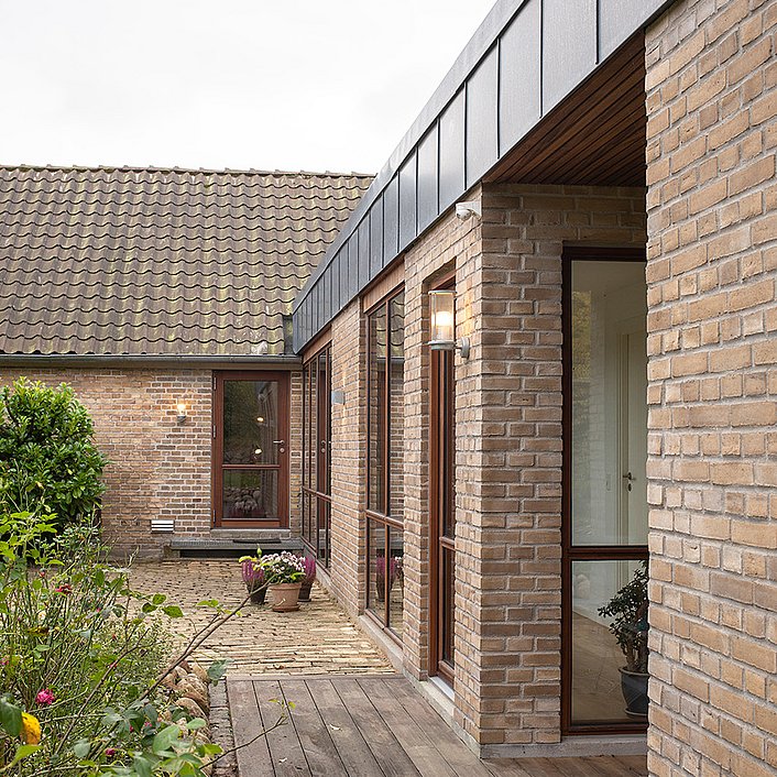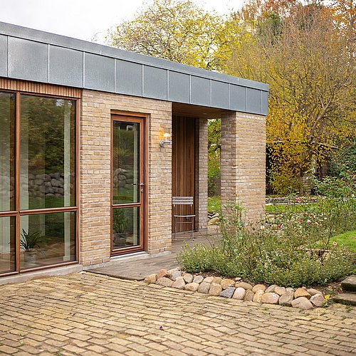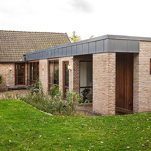 Tilbygningen er udført i nøje udvalgte mursten, der er valgt for at spejle de originale sten fra statslånshuset. For at skabe et harmonisk og helhedsorienteret udtryk blev murstenene fra den tidligere tilbygning samtidig udskiftet. Resultatet er et roligt, afbalanceret og tidløst udtryk, hvor begge tilbygninger nu fremstår som én samlet arkitektonisk helhed. De varme mahognivinduer og sternbeklædningen i zink binder udtrykket yderligere sammen og tilfører eksklusivitet og varme til facaden.