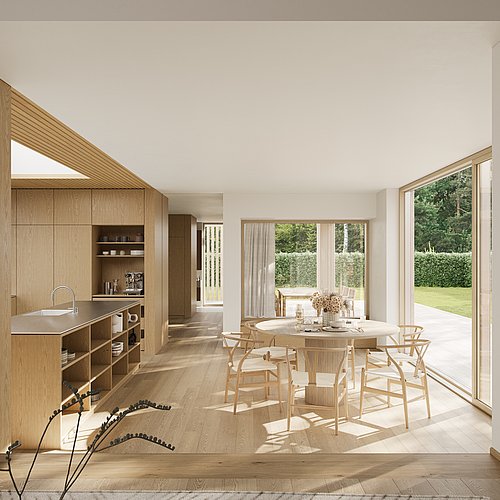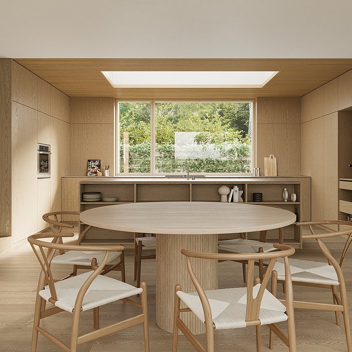 Tilbygningen består af et køkkenalrum, der placeres i overgangen mellem det nye og det gamle for på den måde at blive husets naturlige hjerte og omdrejningspunkt.