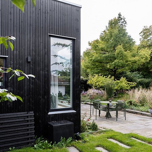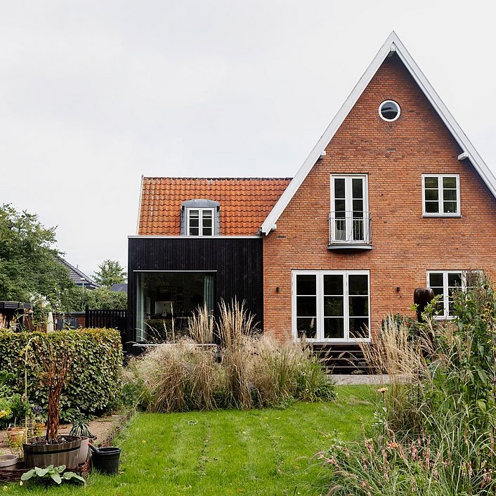Løsningen blev en arkitekttegnet tretrinsløsning, hvor den nyeste tilbygning mod haven og de to tidligere tilbygninger blev bundet sammen af et arkitektonisk greb. De nye facader blev beklædt med sort Superwood i varierende bredder, som skaber et levende lysspil og danner en markant, men afbalanceret kontrast til den rødmurede villa. På den måde fik huset et mere samlet og roligt arkitektonisk udtryk.