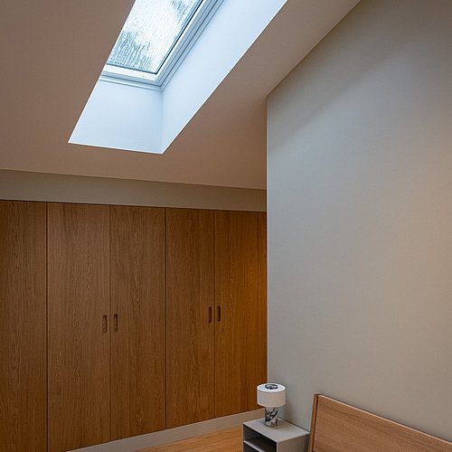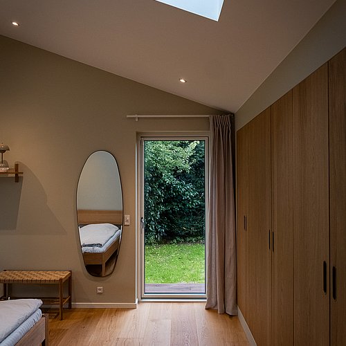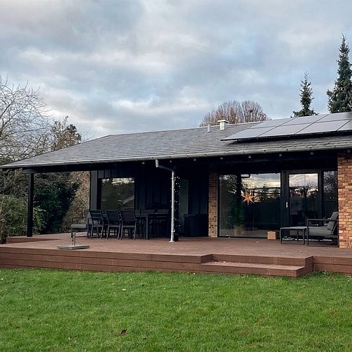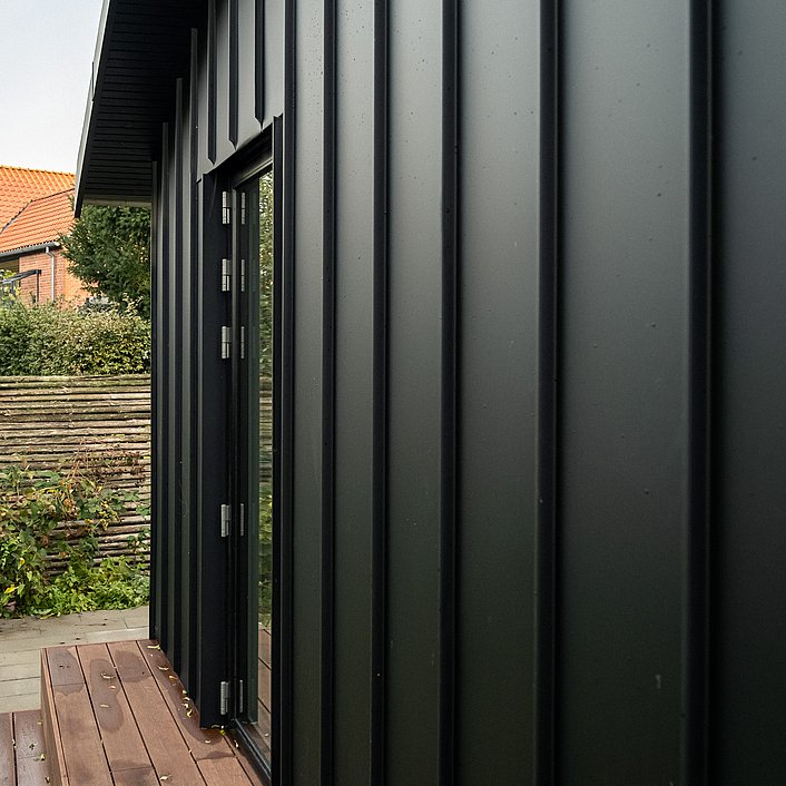 For at opfylde familiens ønske om flere kvadratmeter, en separat voksenafdeling og et ekstra badeværelse, er denne forstadsvilla blevet udvidet. Tilbygningen lægger sig som en naturlig forlængelse af det eksisterende hus, men facaden er trukket let tilbage for at skabe et skønt, overdækket uderum og terrasseareal. Den nye tilbygning markerer sig elegant med sin sorte klikfalsfacade i kontrast til det eksisterende teglstensbyggeri.