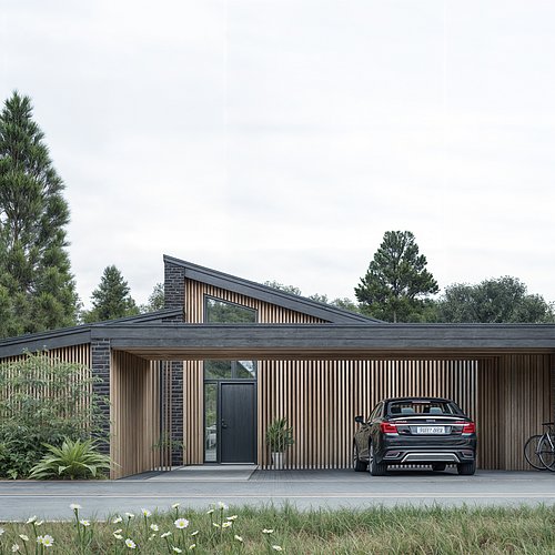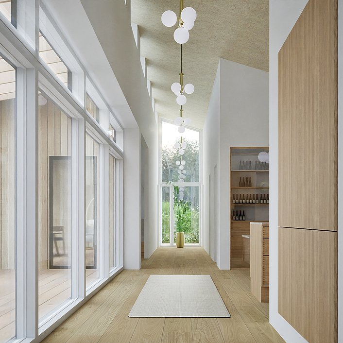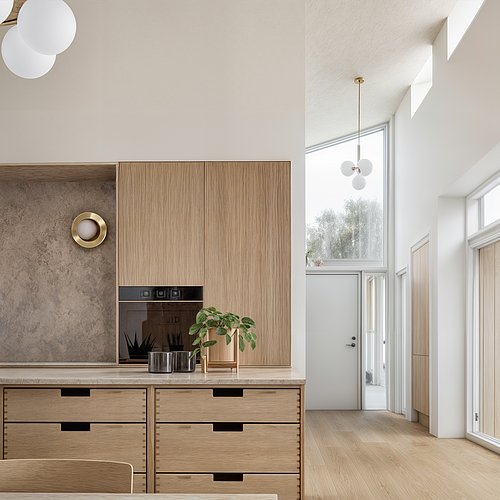 I Østjylland har vi tegnet denne familievilla med et særligt fokus på dagslys og en varm, stoflig materialitet. Store glaspartier og strategisk placerede ovenlys trækker lyset helt dybt ind i boligens hjerte og skaber en flydende overgang til den omgivende have. Indvendigt præges rummene af gennemgående, lyse egetræsflader, integrerede snedkerløsninger og en generøs loftshøjde, der tilsammen skaber en luftig og rolig atmosfære. Resultatet er en tidløs bolig, hvor moderne funktionalitet og arkitektonisk præcision går hånd i hånd gennem hele projektet.