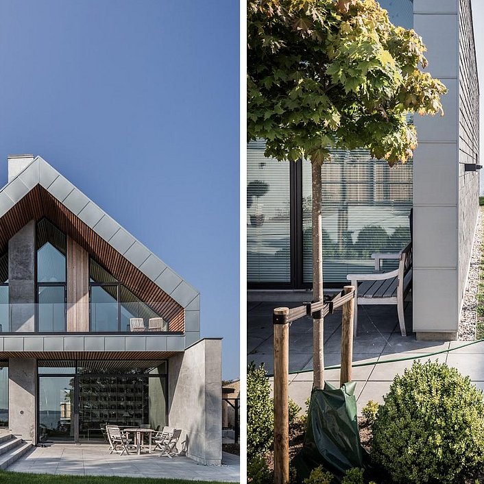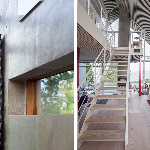 Hvorfor, forstår man straks ved første øjekast. Husets bærende ydervæg, tagets stejle rejsning og etageadskillelsens vandrette dæk danner nemlig tilsammen en foldet figur, der kan 'læses' som et kæmpe stort P - spejlvendt eller retvendt - afhængigt af om det ses fra vejen eller kysten.