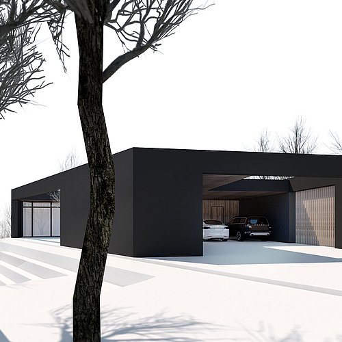 Dette moderne træhus ligger på en skrånende grund, hvor man ankommer i det øverste plan, som rummer alle de primære opholdsrum og udnytter udsigten ud over grunden, mens værelser og sekundære rum ligger i den nederste etage, der graver sig ind i skråningen. Det sorte træværk skaber et grafisk udtryk og der hvor man har skåret sig ind i den sorte masse, bliver udtrykket blødt op med naturtræ.